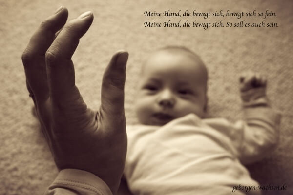 Babys mit 2 bis 4 Monaten lieben es, der Hand eines Erwachsenen zuzusehen. Können sie schon greifen, berühren sie gerne die zappelnden Finger. Probiert es selbst aus: Dreht Eure Hand in einigem Abstand vor dem Gesicht Eures Babys. dazu könnt Ihr singen oder reimen.