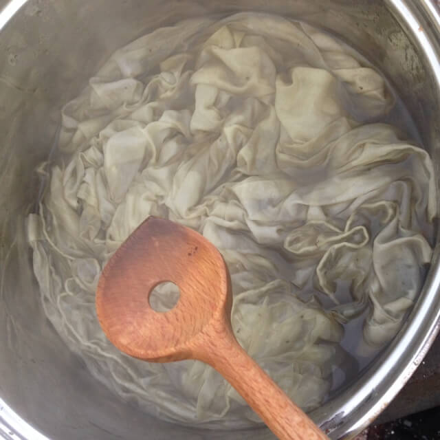 Die Brennnesseln haben so eine gute Stunde vor sich hin geköchelt, dann habe ich sie vom Herd genommen und über Nacht in ihrem Sud stehen lassen. Am Morgen wurden sie durchs Sieb gegossen und die Pflanzenreste kamen auf den Kompost. Die Flüssigkeit wurde dann mit Alaun aufgekocht und darin habe ich meine schöne weiße Bluse und ein Seidentuch für den Jahreszeitentisch gefärbt. Alles war wieder für eine Stunde auf dem kleinen Kinderofen im Garten. Dann wurde den die Sachen kurz heraus genommen, etwas Eisensulfat hinzu gefügt, noch einmal 15 Minuten gekocht und dann schon waren das grüne Tuch und eine leicht grüne Bluse fertig.