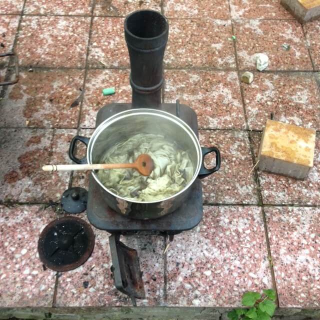 Also habe ich mir morgens die Gartenhandschuhe angezogen und mit dem Rupfen der Brennnesseln begonnen. Einen guten Teil habe ich unter den Kompost gegraben, denn Brennnesseln sind auch für die Erde gut. Und einen halben Topf habe ich mit dem anderen Rest gefüllt. Dies alles wurde dann mit Wasser aufgefüllt, so dass die Blätter gut bedeckt sind, und auf unserem kleinen Kinderherd im Garten zum Kochen gebracht. So konnten die Kinder direkt dabei sein und das Färben miterleben.