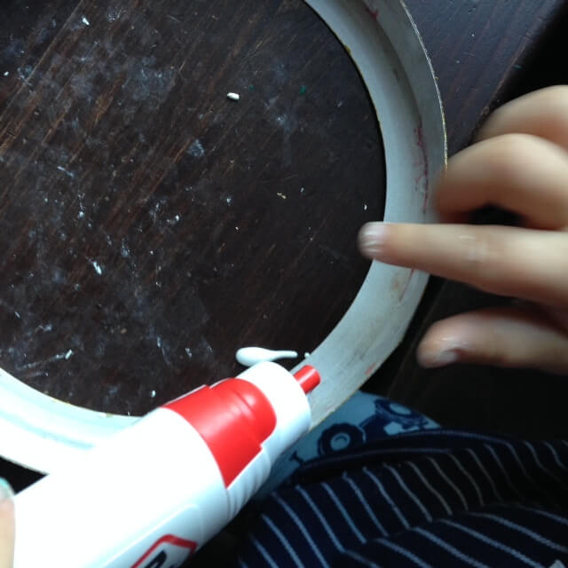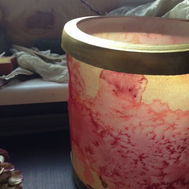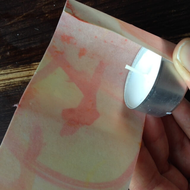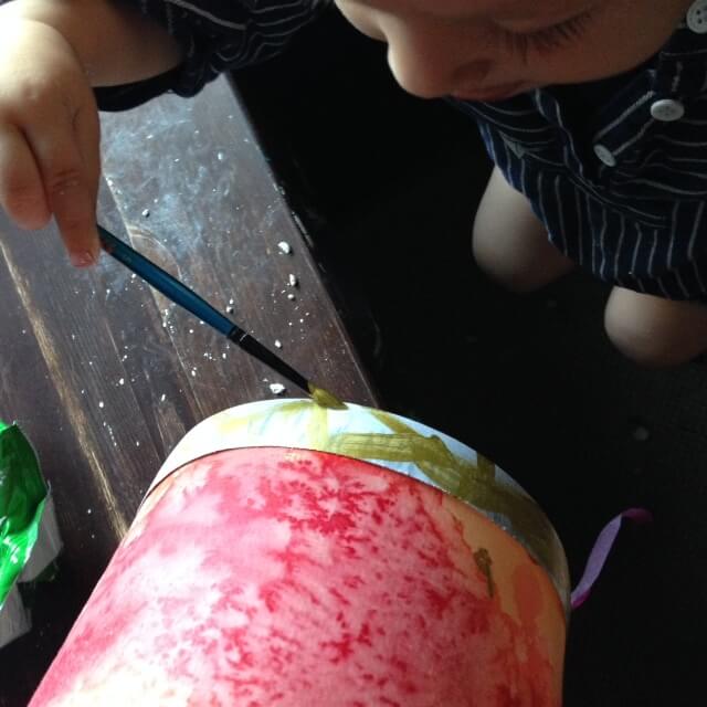 Ist das Papier getrocknet, wird es mit einem Küchenpapier und etwas Speiseöl eingerieben. Auch hier können kleine Kinderhände gut behilflich sein. Anschließend wird der Papierbogen in den Papplaternenring geklebt. Diesen durfte der Sohn im Anschluss noch goldfarben anpinseln.