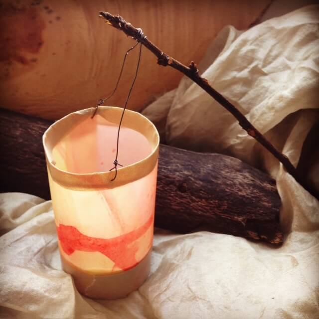 Auch auf dem Jahreszeitentisch wird zu Sankt Martin dekoriert. Papierreste von der Laterne können benutzt werden, um auch hier eine kleine Laterne zu Dekorationszwecken aufzubauen. Dazu wird ein kleiner Streifen des angemalten und geölten Papiers einfach um ein Teelicht gewickelt und festgeklebt. Den oberen Rand habe ich mit Washi-Tape fixiert. Mit einer Nadel auf zwei gegenüber liegenden Seiten am oberen Rand Löcher in die Laterne pieksen und einen kleinen Draht durchziehen. Die Laterne kann dann an einen kleinen Zweig gehangen werden.