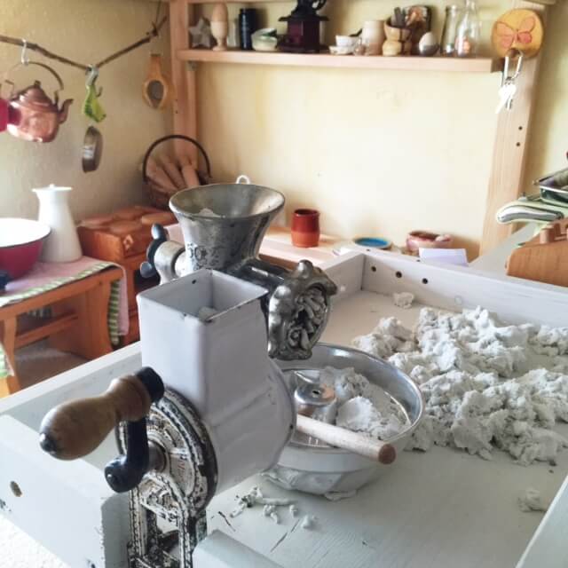 Zwei gegenüber liegende Ränder habe ich auf einer Höhe mit dem Bodenbrett befestigt, die zwei anderen stehen unten etwas über, so dass der Sandkasten nicht vom Tisch verrutschen kann. Beim Spielen mit Knete und Sand sind der Fleischwolf und die Reibe große Favoriten. Deswegen habe ich in den Sandkastenrand kleine Einlassungen gemacht, in die Fleischwolf und Reibe gesetzt werden können. Das Messer des Fleischwolfes ist übrigens entfernt.