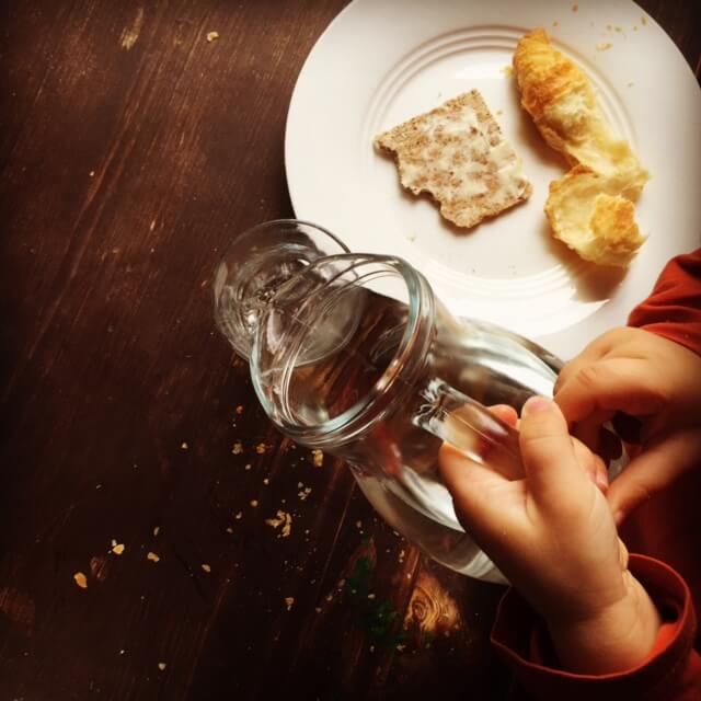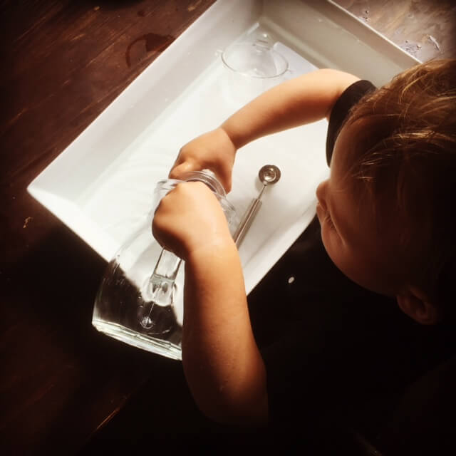 Mit zwei kam das Einschütten und Umschütten von Flüssigkeiten in den Fokus des Sohns. Schüttspiele wurden wichtig. Schon vorher war das Umschütten von Sand und Schüttspiele mit Erbsen, Bohnen oder Nudeln beliebt. Der Umgang mit Flüssigkeiten ist eine Erweiterung dieses Spiels. Gespielt wurde natürlich besonders in der Badewanne oder im Spielzimmer in einer großen Schüssel. Doch auch in der Küche stand der Wunsch, sich selber das Wasser einschütten zu dürfen, im Raum. Für die bessere Handhabung gibt es extra kleine Kannen und eigene Tassen und Gläser, die sich gut halten lassen. Durch den eigenständigen Umgang mit der Kanne ist es auch am Essenstisch entspannter geworden, weil sich die Kinder einfach selbst bedienen können anstatt eingegossen bekommen zu müssen.