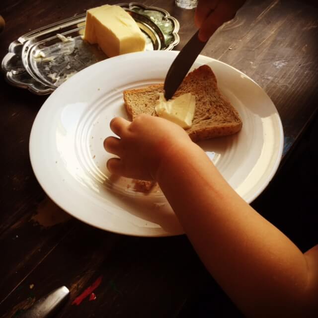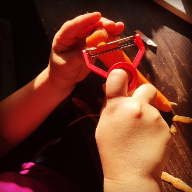 Manchmal werde ich gefragt, ob das nicht anstrengend sei, wenn die Kinder so selbständig am Alltag teilhaben, wenn wir sie einfach machen und helfen lassen. Tatsächlich bin ich der festen Überzeugung, dass es trotz aller Pannen, die vorkommen können (etwas ausgießen, Geschirr geht zu Bruch, kleine Schnittverletzung), entspannter ist, wenn die Kinder an all dem teilhaben können. Denn sie erwerben dadurch schnell Kompetenz und können nach anfänglichen Missgeschicken schon bald gut mithelfen. Und dies entspannt und erfreut nicht nur die Kinder, sondern auch mich: Denn jede helfende Hand ist im Alltag willkommen.
