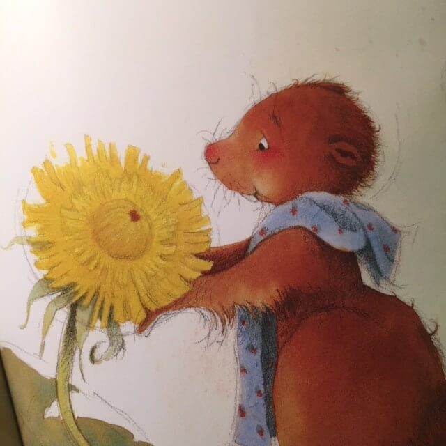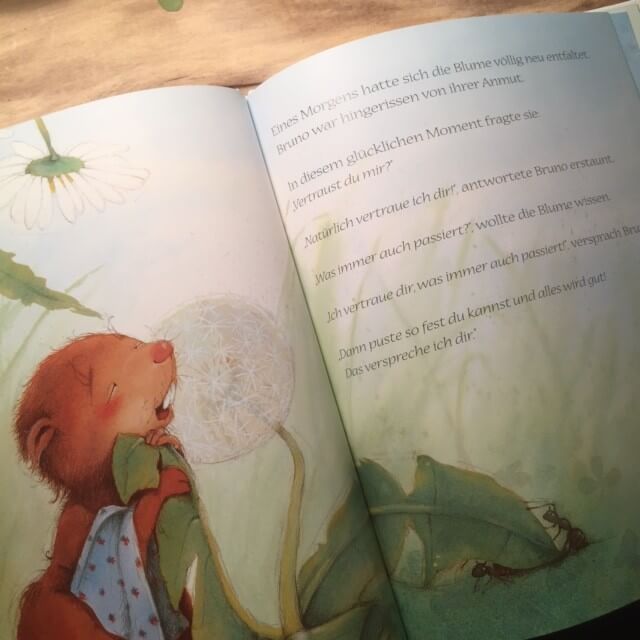 Ebenso sanft ist das auch von Eve Tharlet illustrierte „…das verspreche ich dir„. Ich mag diese Bilder einfach sehr, weshalb sie sich so viel in unserem Bücherregal finden lassen. In der Geschichte von Knister geht es um das Murmeltier Bruno, das sich in einen Löwenzahn verliebt. Dieser wandelt sich doch zum Ende des Frühlings in eine Pusteblume und stellt Brunos Vertrauen auf eine Probe, als alle Samen davon fliegen und er allein zurück bliebt. Erst nach dem Winterschlaf versteht er, warum er vertrauen sollte.