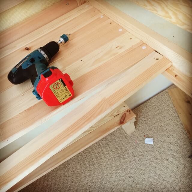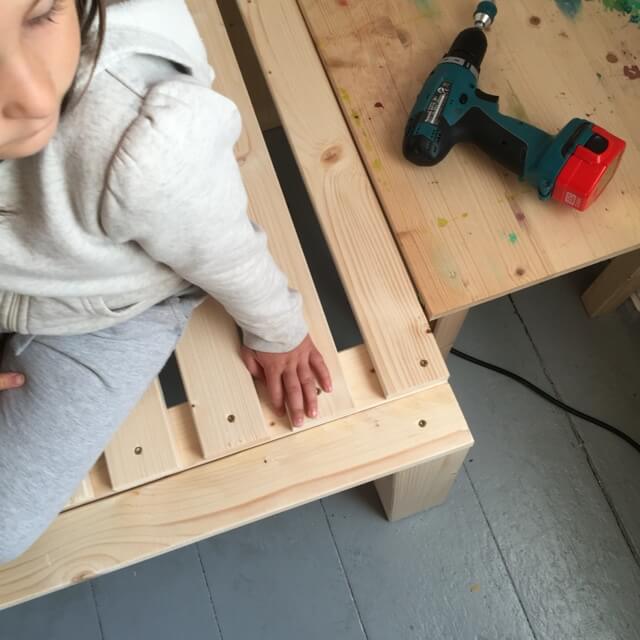 Die untere Etage haben wir dann wie auch schon unser letztes Bett nach dieser Anleitung von Wand zu Wand selber gebaut. Es ist etwa 2,70m breit. Da es von Wand zu Wand gebaut ist, kann seitlich kein Kind herausrollen.