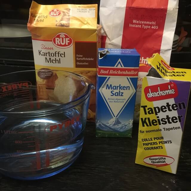 Tapetenkleister und Wasser vermengen, Tapetenkleister darin einige Minuten aufquellen lassen. Mehl, Kartoffelmehl und Salz vermengen, das Tapetenkleister-Wasser-Gemisch dazu geben und alles kräftig zu einer festen Masse verkneten.
