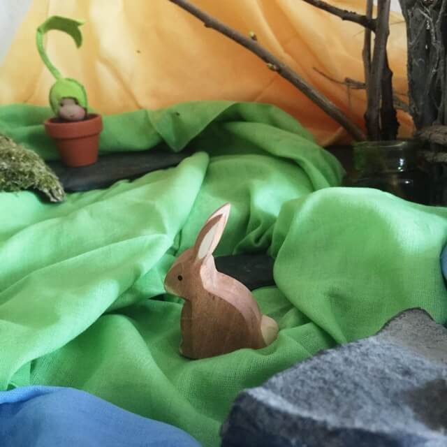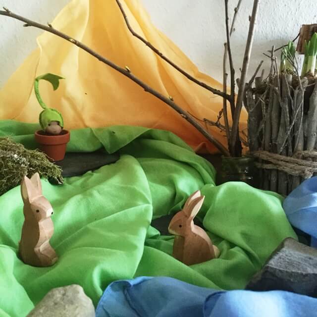 Im Vergleich zu sonst finde ich unseren März-Jahreszeitentisch schon fast ein wenig minimalistisch, denn diesmal dominieren nicht Figuren oder andere Accessoires, sondern einfach die Farben der Tücher. Ich habe hierfür ein klassisches Set aus Jahreszeitentücher – Frühling genutzt und die Farben Gelb (für den Hintergrund), Grün (für den Untergrund) und ein helles Blau für einen Fluss gewählt. Dazu kommen zwei Holzhasen