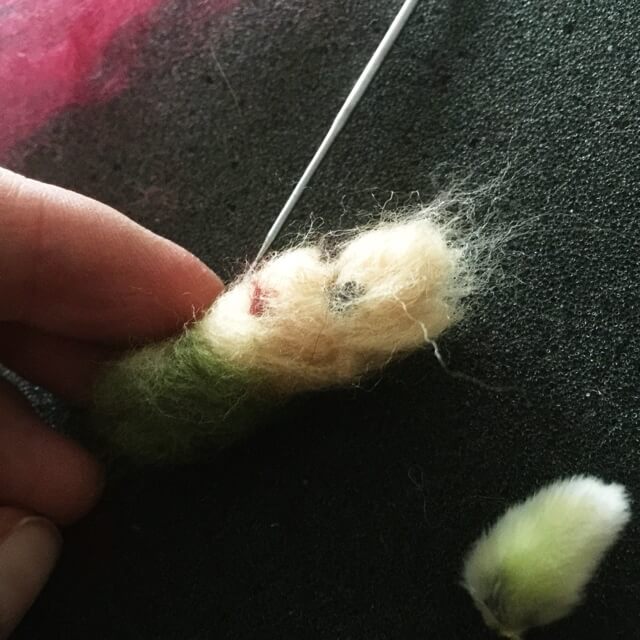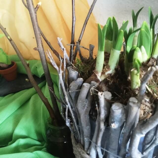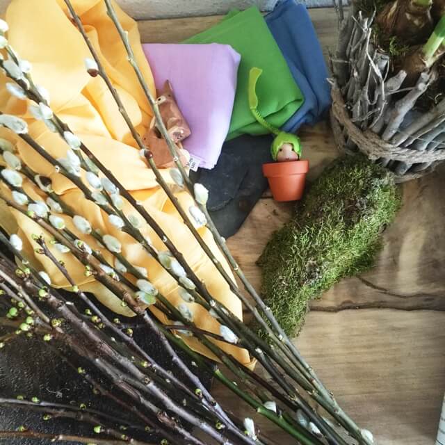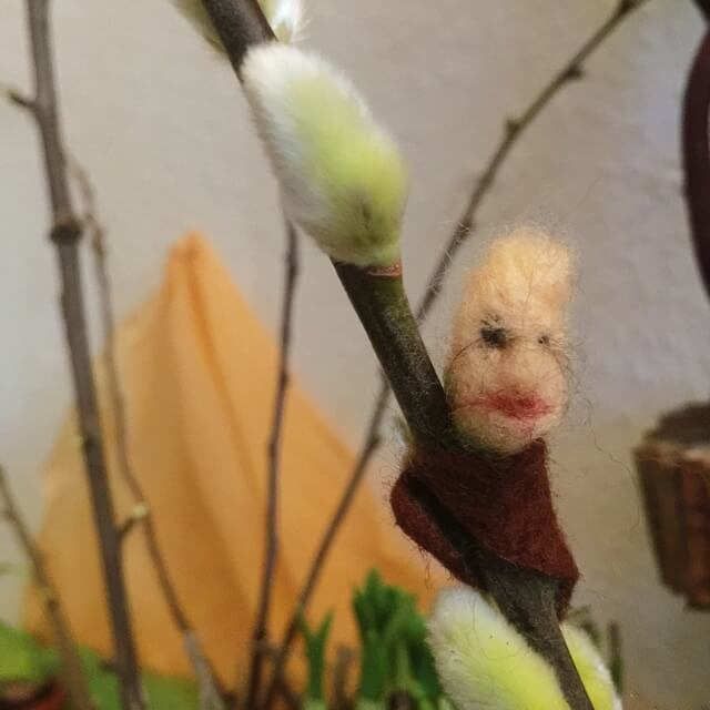 Passend in diesem Monat sind natürlich auch Wurzeln und Zweige mit Knospen oder die immer wieder so wunderbaren Weidenkätzchen, die mir die Kinder aber jedes Jahr heimlich nach und nach abzupfen vom Zweig, weil sie so schön weich sind und immer gerne bespielt und zum Streicheln benutzt werden oder im Kaufmannsladen. Als kleine Überraschung habe ich diesmal ein kleines Weidenkätzchen ersetzt durch ein gefilztes Weidenkätzchen mit Gesicht. Ich denke, es hat noch Potential in der Gestaltung, aber ich bin gespannt, wann sie es entdecken. Auch ein paar Frühlingsblumen wachsen auf dem Tisch in einem Töpfchen aus Holzstücken.
