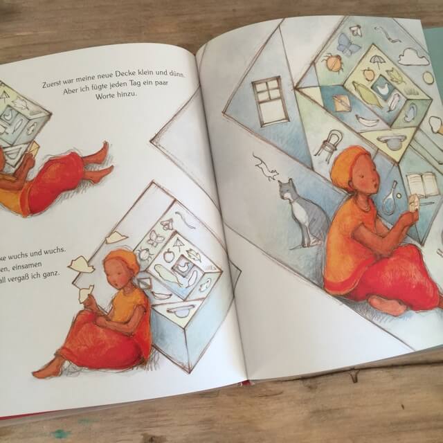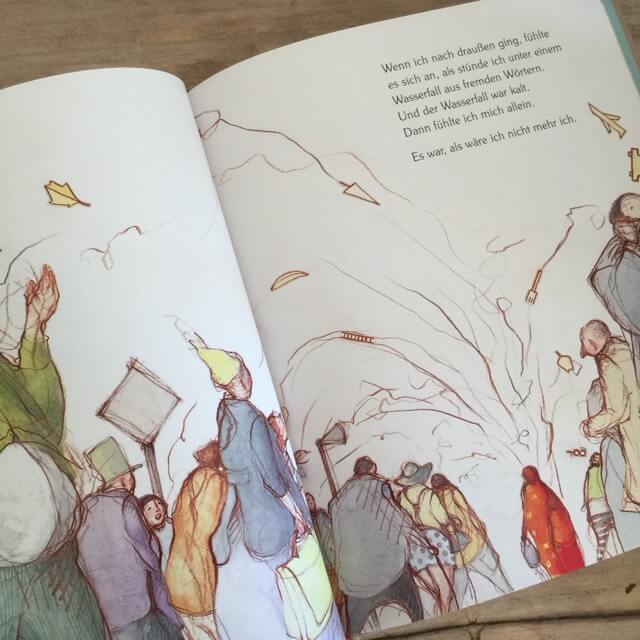 Ein weiteres Buch habe ich wegen des Themas für die Kinder, besonders die große Tochter, ausgewählt: „Zuhause kann überall sein„. Da in ihrer Klasse Kinder sind, die aus anderen Ländern kommen und zum Teil noch sehr wenig deutsch verstehen oder sprechen, habe ich ein Buch gesucht, das dieses Thema behandelt. In der Geschichte um das Mädchen Wildfang wird mit wenigen Worten sehr schön verdeutlicht, wie es sich anfühlt, in einem Land zu sein, in dem eine andere Sprache gesprochen wird und man nichts versteht. Und es zeigt, wie wichtig es ist, gerade dann liebevoll angenommen zu werden und Freunde zu finden, die diese Sprache erklären, damit sie einen Tages kein „kalter Wasserfall“ mehr ist. Schade ist jedoch, das sich das Mädchen eine neue Decke gestalten muss, die es sprachlich umhüllt anstatt die bereits vorhandene Decke zu erweitern. Denn schließlich wird auch in einem neuen Zuhause die Herkunft und Identität nicht abgelegt. Daher gibt es einige Punkte, die im Gespräch mit dem Kind noch erweitert werden müssen, aber es ist schon einmal ein guter Gesprächsanlass.