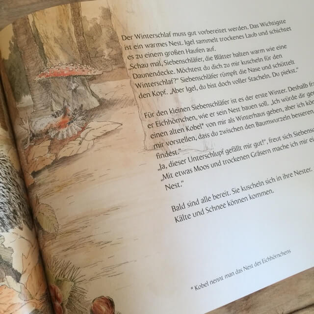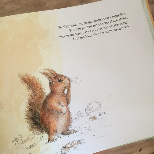 Ebenfalls ein schönes Vorlesebuch ist Susanne Timbers „Das vergessliche Eichhörnchen„. Das Eichhörnchen ist nicht mehr jung und vergisst ab und zu, wo es seine Nüsse versteckt hat. Doch seine Freunde Siebenschläfer und Igel helfen ihm, sich erinnern zu können. Während das Eichhörnchen und seine Freunde in den Winterschlaf geht, nutzt der Eichelhäher jedoch seine Chance und klaut den gesamten Wintervorrat des Eichhörnchens. Dieses glaubt nach dem Erwachen natürlich, dass es einfach nur vergessen hat, wo die Nüsse sind. Als es kraftlos zusammenbricht,erkennt der Eichenhäher sein falsches Verhalten und rettet gemeinsam mit Siebenschläfer und Igel das Eichhörnchen. Die rührende Geschichte über Winterschlaf und nahenden Frühling ist mit wunderschönen, sanften Bildern unterstrichen.