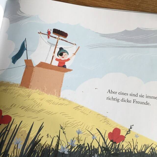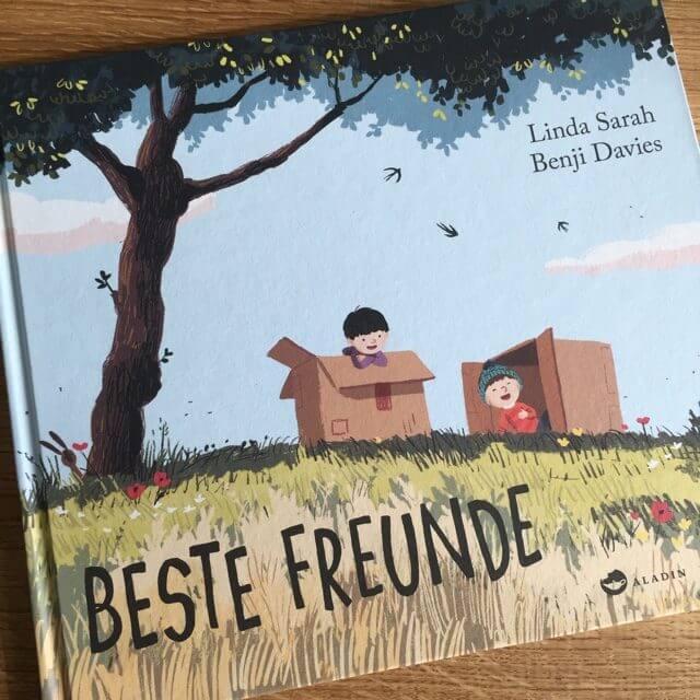 Ein schönes Buch, das wir schon eine ganze Weile bei uns haben, ist „Beste Freunde“ von Linda Sarah und Benji Davies. Da es so wunderschöne sommerliche Farben hat, passt es gerade jetzt gut zum Vorlesen. Zudem geht es um ein Thema, das gerade in den Ferien sehr aktuell ist: Wie Kinder zusammen spielen und sich Freundschaften entwickeln. Ben und Eddy sind nämlich beste Freunde und spielen jeden Tag mit ihren Pappkartons phantasievolle Spiele bis eines Tages Sam auftaucht, der mitspielen möchte. Auf einmal fühlt sich Ben ausgeschlossen und es scheint fast, als sei die Freundschaft beendet. Doch Eddy und Sam finden einen Weg, um Ben doch wieder einzuschließen und sind schließlich ein gutes Dreierteam.