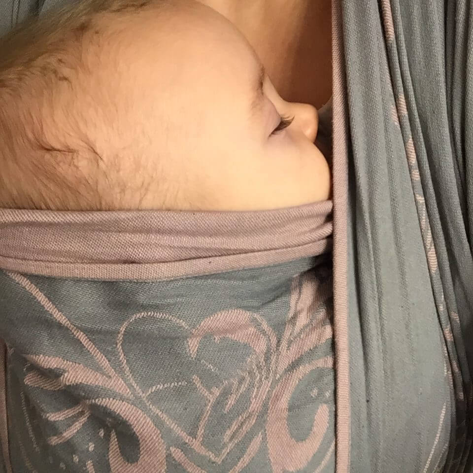 Dafür kamen die verschiedenen Tücher und Tragehilfen zum Einsatz, die ich über die Jahre gesammelt habe: vom Bondolino über Emei bis WrapTai. Mein Tragetuchstapel umfasst Tücher und Slings von Didymos, MamaNuka, Oscha und Pavo – schwere und leichte Tücher, bunt und schlicht, aus Baumwolle, Wolle, Seide. Sie sind ein wenig wie Kleidungsstücke und jeden Tag suche ich das aus, das gerade passt. Und nun habe ich ein ganz eigenes machen lassen nach meinem Motiv: das Geborgen Wachsen Tuch.