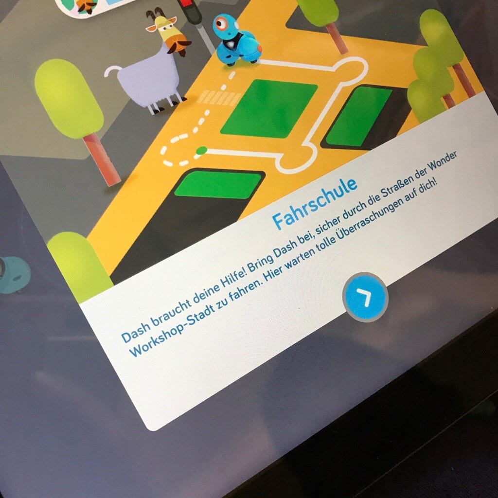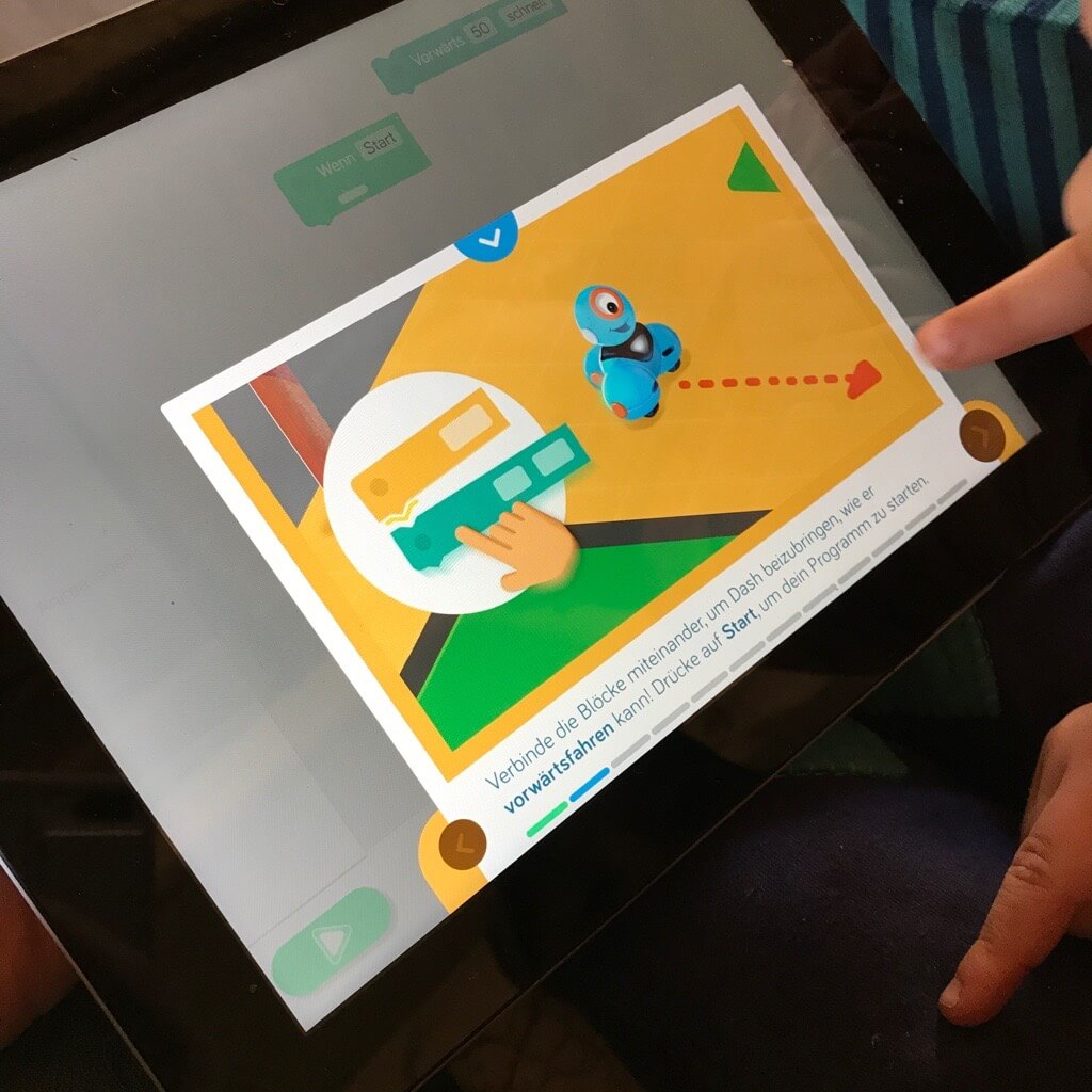 Der programmierbare Roboter Dash von Wonder Workshop ist ein handliches Gerät für Kinder ab 6 Jahren und auch ausreichend stabil, um im Alltag bestehen zu können. Über die zugehörigen Apps kann Dash nicht nur einfach ferngesteuert, sondern richtig programmiert werden: Mit einzelnen Bausteinen, die in der Blockly App zusammengesetzt werden, können komplexe Handlungen programmiert werden. Wie lang die Strecke sein soll, die er fährt, ob er dabei abbiegt in die ein oder andere Richtung, sich vielleicht dreht oder etwas sagt, kann eingegeben werden. Klebt man beispielsweise eine Fahrtstrecke auf den Fußboden, kann das Kind den Roboter so programmieren, dass er diese Strecke genau entlang fährt. Auch wenn er auf den ersten Blick erscheint, als würde sein „Auge“ eine integrierte Kamera sein, ist hier nichts zu befürchten: Dash hat weder eine Kamera noch sonstiges Überwachungspotential. Erste Schritte zur Programmierung können in der App mit einem kleinen Führerschein erlernt werden, später können eigene Ideen umgesetzt werden. Die App Blockly ist beispielsweise so aufgebaut, dass es einen ansteigenden Schwierigkeitsgrad gibt und die zu programmierenden Aufgaben immer anspruchsvoller und komplexer werden. Sogar eigene Wörter und Sätze können aufgenommen und von Dash mit entsprechendem Befehl wiedergegeben werden. Neben der Programmierapp Blockly gibt es auch weitere Apps, die genutzt werden können. An einigen Stellen ist die Übersetzung aus dem Englischen nicht ganz geglückt und unser Kind musste nachfragen, was mit einer Aufgabe konkret gemeint sei. Insgesamt jedoch sind Roboter und App von einem Schulkind nach kurzer Zeit allein bedienbar. Sarah von Sarah von mamaskind.de hat hier einen sehr ausführlichen Bericht über die einzelnen Apps und Funktionen geschrieben. Wer in Berlin wohnt und sich für das Programmieren interessiert, kann sich einmal die Workshops im Juniorlab ansehen.