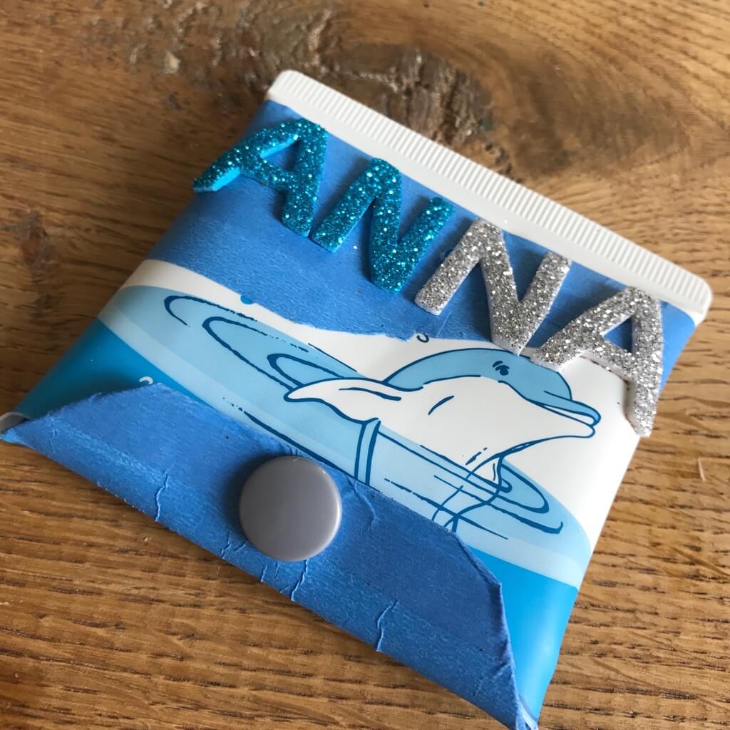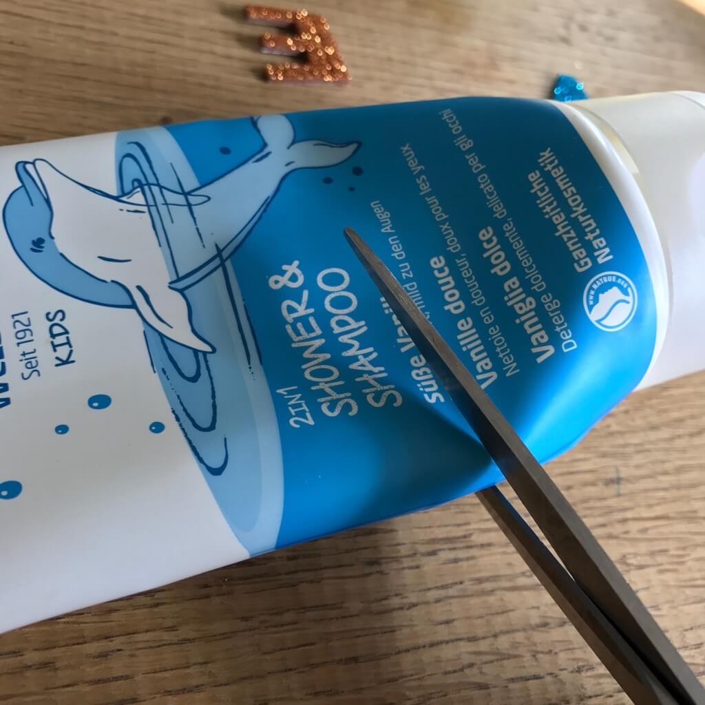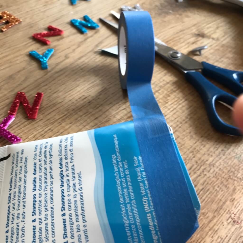 Schneide das untere Teil der Duschtube ab und spüle es gründlich aus. Am besten, wenn sowieso gerade jemand duschen oder baden möchte, denn selbst gut ausgedrückte Tuben haben oft noch viele Rückstände im Inneren. Schneide die Duschtube zurecht, so dass der hintere Teil der Verpackung etwa 2cm länger ist. Runde die Kanten mit der Schere etwas ab und umklebe sie mit buntem Washi Tape, so dass sich kleine Hände nicht an den Plastikkanten verletzen können. Abschließend platziere Kam Snaps so, dass die kleine Tasche damit geschlossen werden kann.