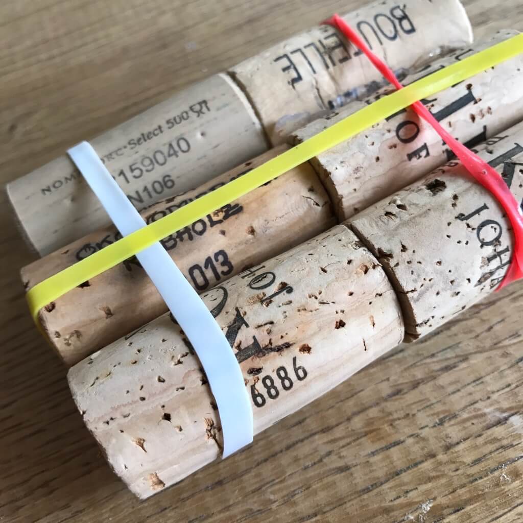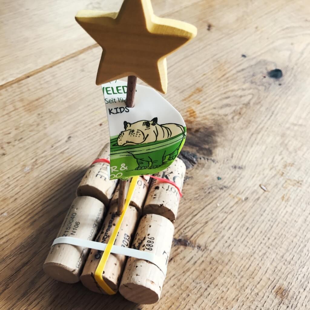 Aus Korken, Gummiband, Holzspieß und Duschtube lässt sich auch leicht ein Spielzeug für die Badewanne bauen. Korken nebeneinander legen und mit Gummiband aneinander fixieren. Ein Segel aus Plastik aus der Duschtube ausschneiden und mit einem Holzspieß am Boot befestigen.
