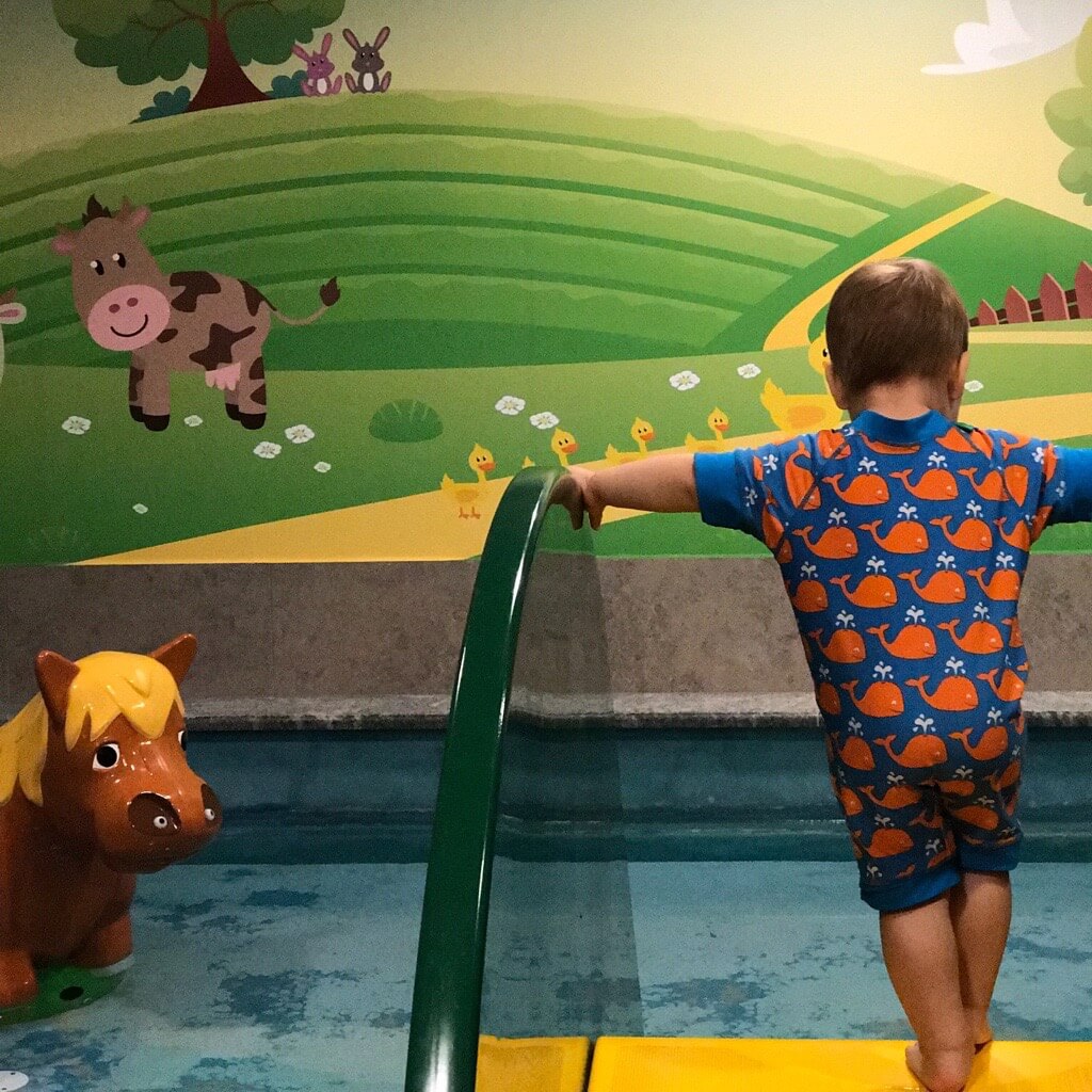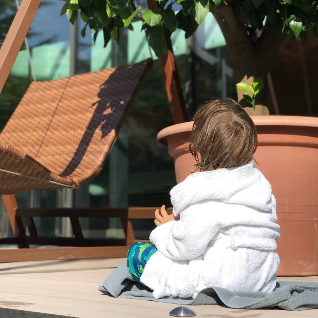 Die Kinderbetreuung ist jedoch ein Angebot, kein Muss: Denn Kinder sind hier überall willkommen (bis auf den Spa-Bereich im vierten Stock, der nur für Menschen ab 16 Jahren gedacht ist). Es gibt ein extra Familien Spa mit eigenen Kinderangeboten, beispielsweise ein gemeinsames Bad mit Vater oder Mutter und anschließender Massage. Der gesamte Außenbereich mit mehreren Pools ist für Kinder genau so zu nutzen wie für alle anderen Gäste und zusätzlich gibt es im Haus extra Kinderpools mit Wasserspaßangeboten und einem extra Babybecken. Auch hier ist wieder an die Bedürfnisse der Eltern gedacht: Während die Kinder im Kinderpool planschen, können die Eltern im Whirlpool daneben liegen und haben die Kinder jederzeit im Blick. In den Saunen im Familienbereich gibt es extra Angebote mit Hinweisen zum saunieren mit Kindern.