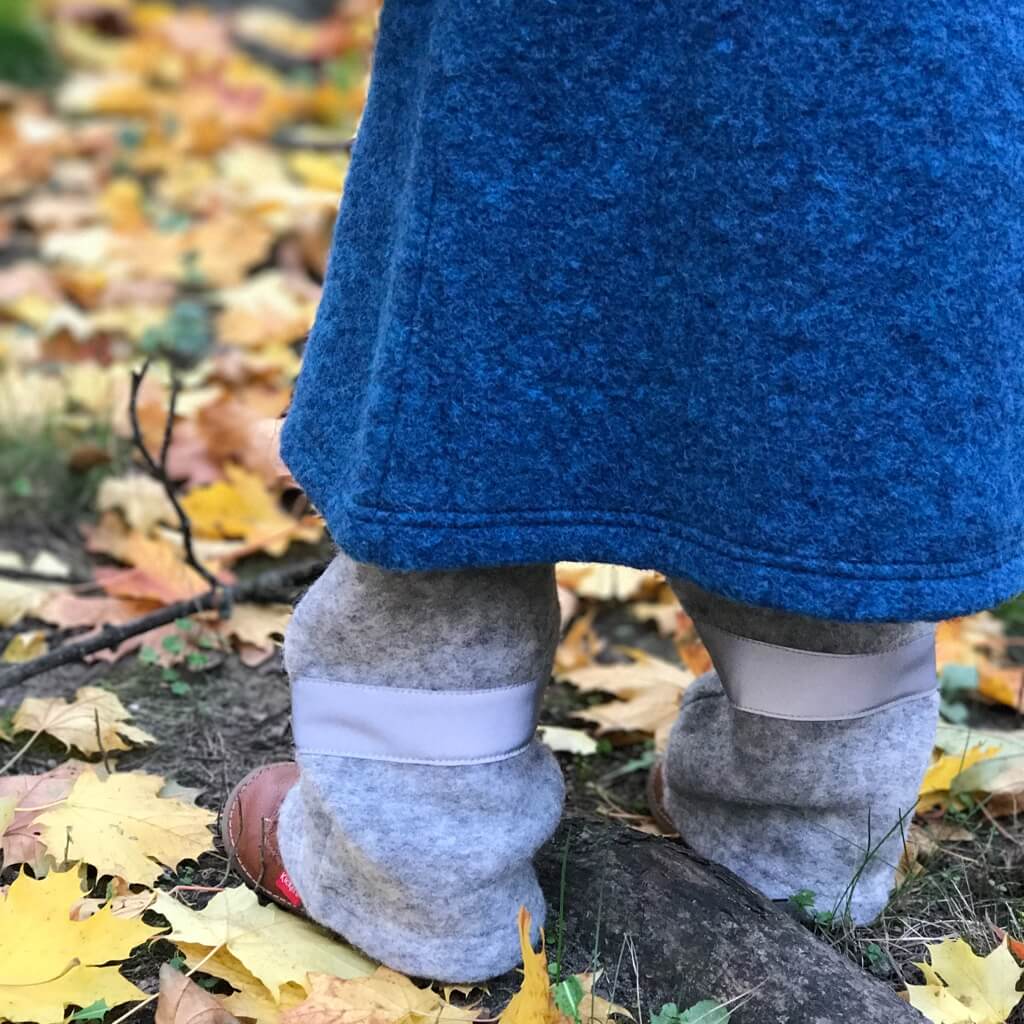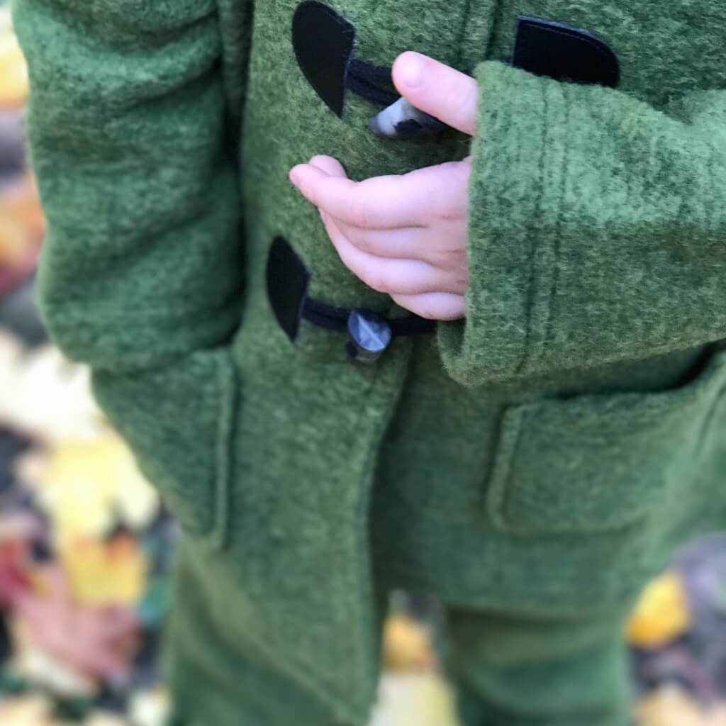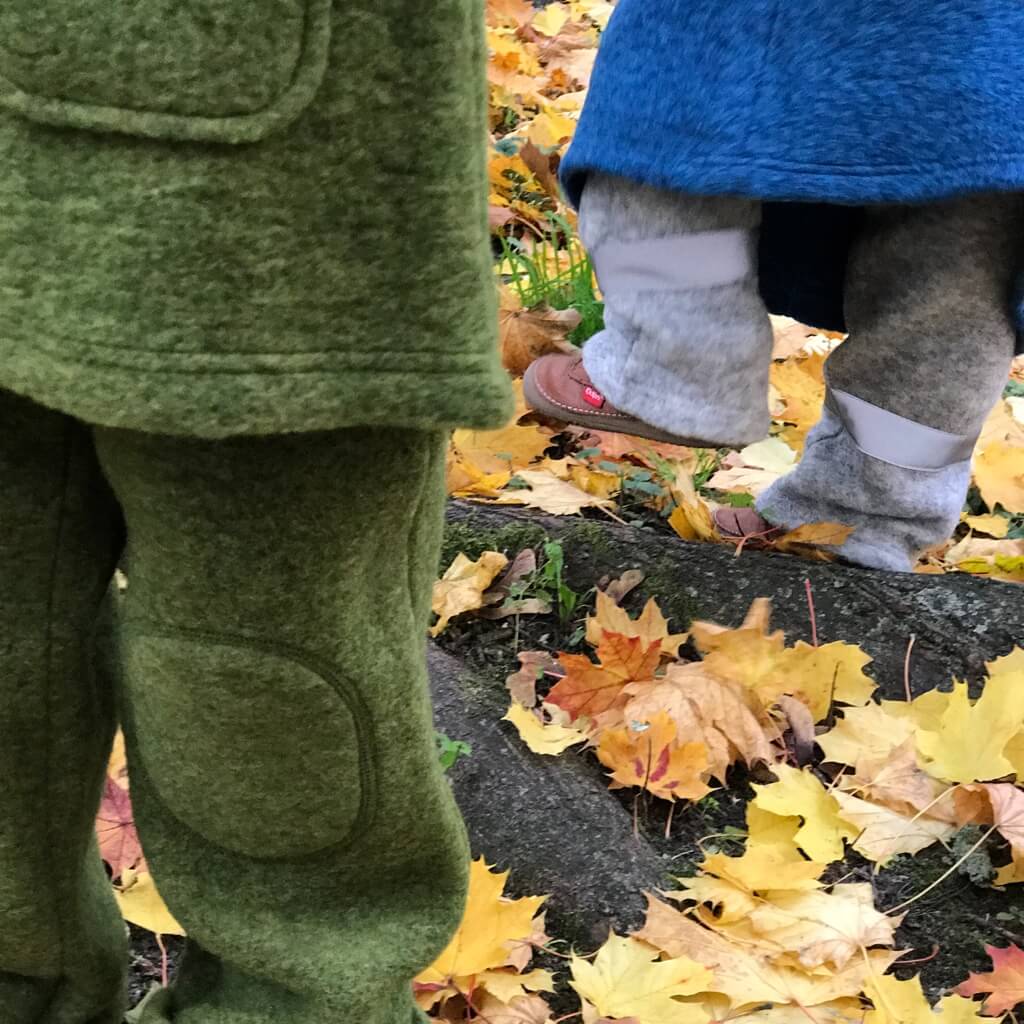 Wer nun nach Wollkleidung für Kinder sucht, stößt immer wieder auf Wollfleece und Wollwalk. Wollfleece wird aus einem Wollfrottee hergestellt, welches durch Bürsten zu einem kuschelig weichen Stoff wird, der wärmt und in geringem Umfang Wasser abperlen lässt. Es ist auch ein wunderbar schönes Material, gerade für Hosen drinnen oder auch kleine Traglinge. Beim Wollwalk hingegen wird ein festerer, verdichteter aber auch weicher Stoff hergestellt durch den Vorgang des Walkens. Die eingeschlossenen Luftkammern sorgen dafür, dass der Walkstoff wärmt. Durch seine Struktur ist er robust und Wasser und Schmutz abweisend, was ihn zu einem sehr guten Material für Kleidung macht, die draußen genutzt wird. Wird der Wollwalk doch einmal stärker verschmutzt, kann er in der Waschmaschine im Wollwaschgang gewaschen werden. Aufgrund der Herstellung läuft der Wollwalk nicht noch einmal ein und ist insgesamt ein pflegeleichtes Naturmaterial. Für uns sind Wollwalkprodukte daher seit vielen Jahren die richtigen Begleiter in der kalten Jahreszeit, weil die Kinder sich darin gut in der Natur bewegen können, gewärmt sind und selbst auf dem Boden sitzen ist in warmen Walksachen kein Problem für sie – eine ökologische Alternative zu konventioneller Outdoor-Kleidung. Für Kindergarten, Wald und Spielplatz ist für alle Kinder, die sich selbst fortbewegen, der Wollwalk eine gute Wahl. Mehr über die positiven Eigenschaften von Wollwalk gibt es hier zu lesen.