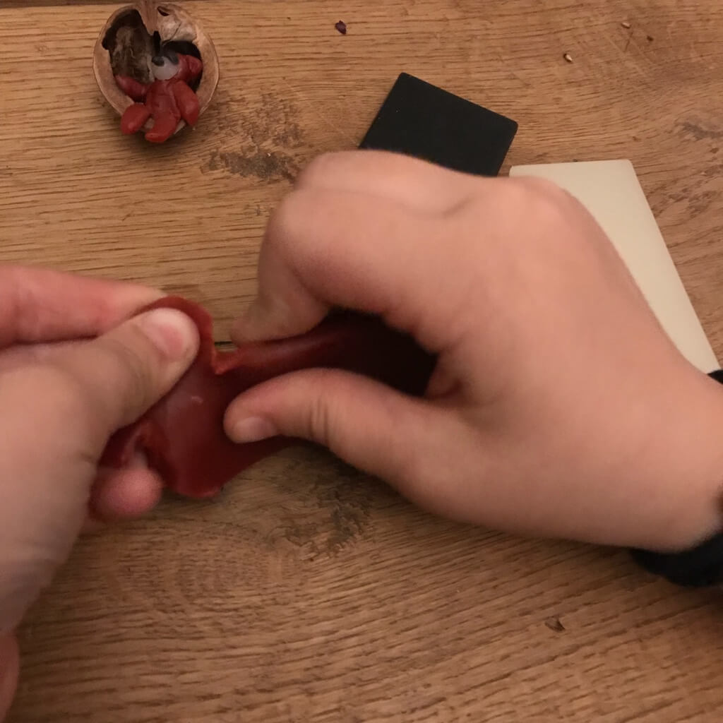 In die Walnussschale kann mit Bienenwachs gestaltet werden, was gefällt: Teddybar, Apfel, Maus, Geschenke, Weihnachtsbaum,… Damit die gestalteten Kunstwerke etwas besser halten, kannst Du (oder ein größeres Kind) sie kurz an einer Kerze erwärmen. Mit etwas Kleber wird am oberen Ende eine Aufhängung angebracht.