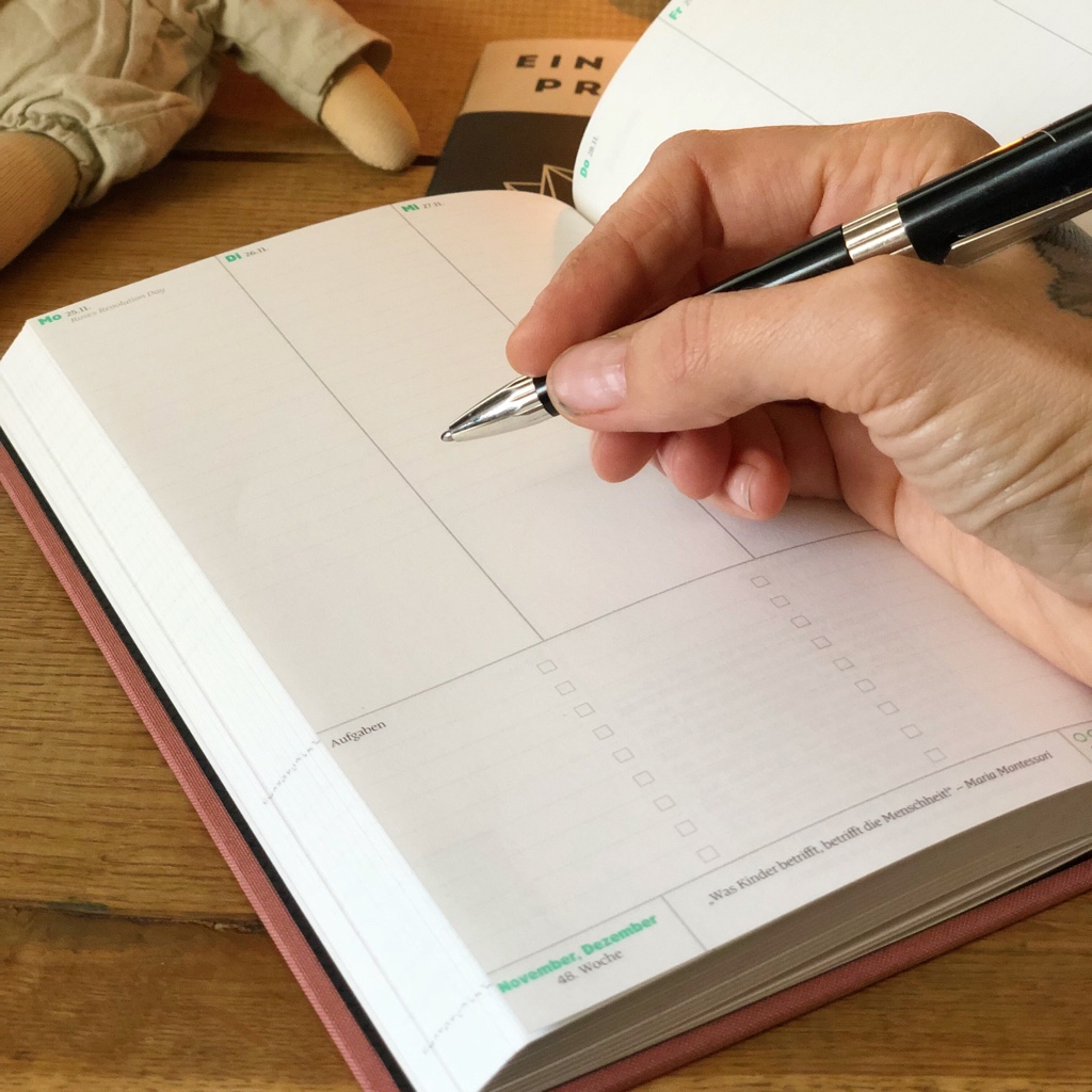 Ich hätte ihn gern in smaragdgrün. Mit 2 Kindern unter 2 Jahren kann man den Fokus und die Achtsamkeit aus den Augen verlieren. Ich denke, dass dieser Kalender helfen würde. Denn organisieren muss man mit einem 4 Personen-Haushalt immer!
