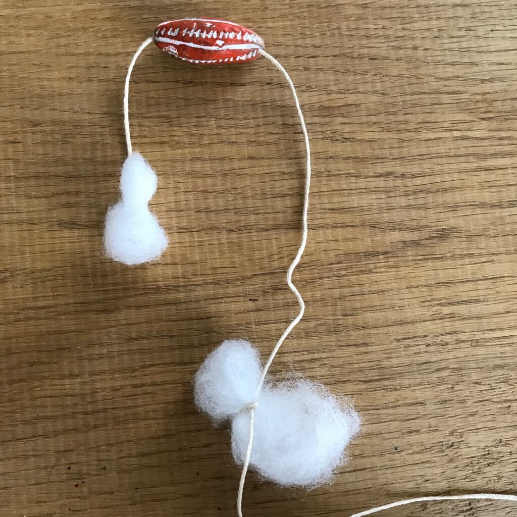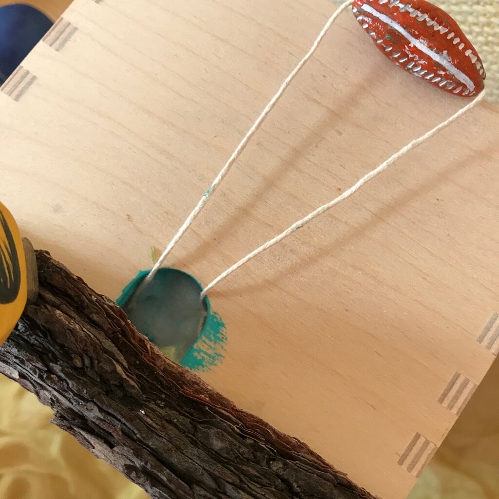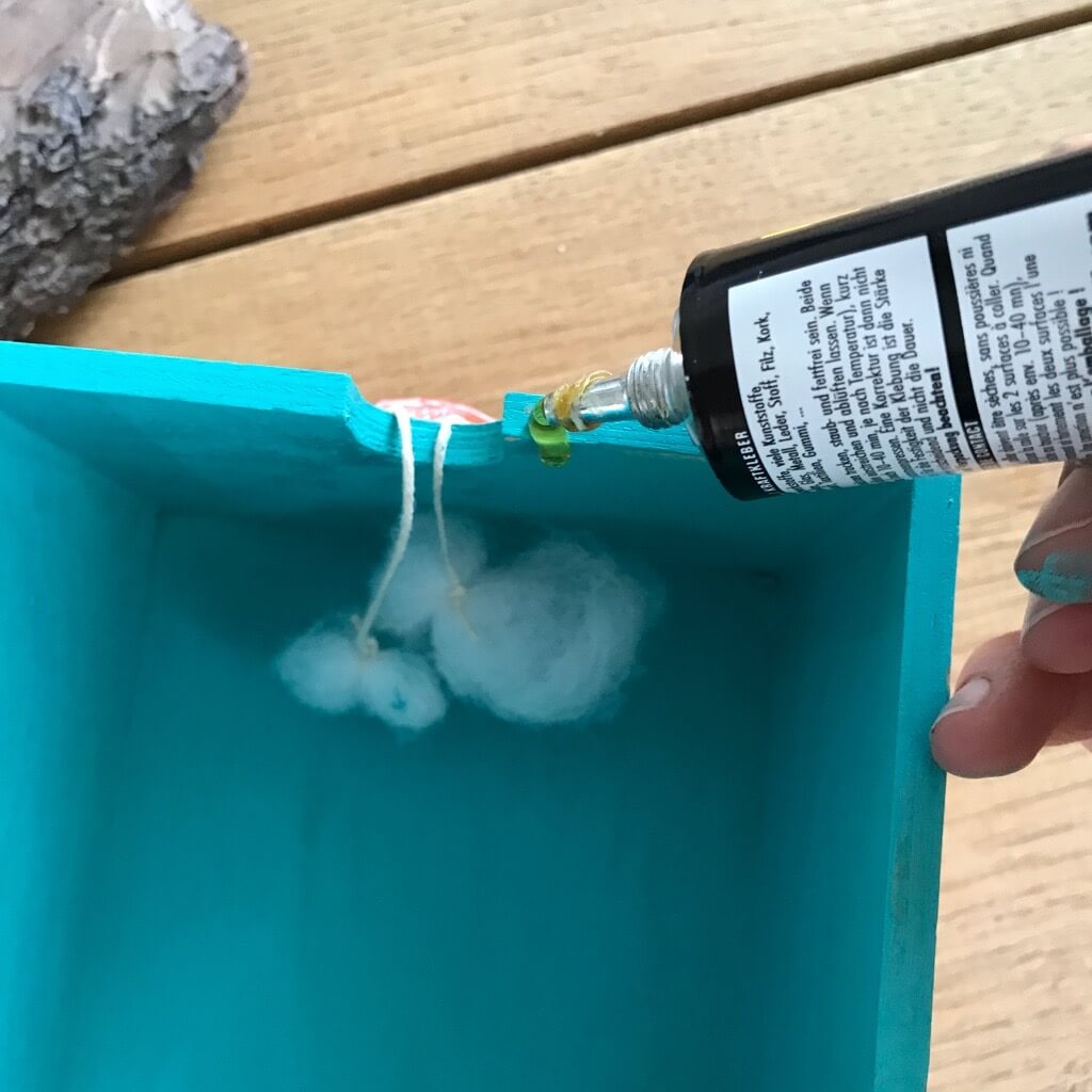 Unsere Kiste war zuvor eine Holzschubalde und hat an einer Seite eine kleine Aussparung. Diese habe ich genutzt, um dort einen Faden durchzuziehen, an dem noch weitere Wolken befestigt werden können.