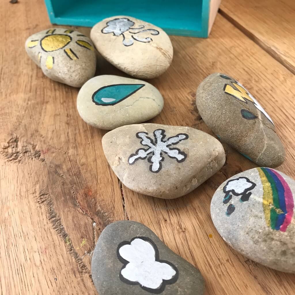 Die Holzkiste dient später der Aufbewahrung der Wettersteine. Du kannst sie daher in der Farbe des Himmels anmalen oder auch mit einem schönen Naturhintergrund gestalten. Wähle anschließend Steine aus, die sich gut aufstellen lassen. Auf diese können dann die verschiedenen Wetterlagen gemalt werden: sonnig, wolkig, stürmisch, bewölkt, regnerisch, wechselhaft, Schnee,…