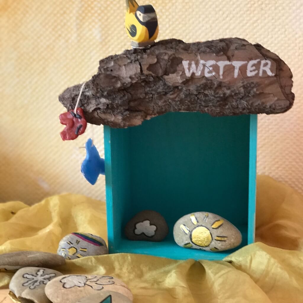 Unsere kleine Wetterkiste wird nun über die Kommode der Kinder gehangen. Jeden Morgen kann dann ein Kind die Wettervorhersage hören, die passenden Steine heraussuchen und die Kleidung, die an die Wetterkiste gehangen wird. Damit sind wir in einem Gespräch über Wetter und Kleidung, die Kinder werden dafür sensibilisiert und können ihre Gedanken und Erfahrungen auf die eigene Kleiderauswahl übertragen.